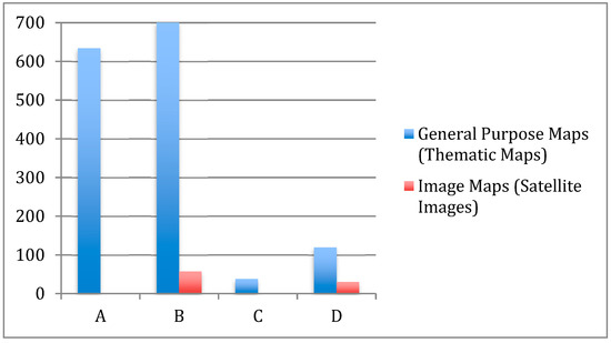 Figure 6 shows the statistics related to the main titles of maps. However, as mentioned before in Section 2.1, since data were not available in other class except thematic maps under the title of general purpose maps, the table was organized in this way. Similarly, there are only satellite images under the title of image maps. In other words, since there were no aerial photographs in the newspapers, all image maps were satellite images. Due to the technological conditions of the period, it was difficult to obtain satellite images, so the number of satellite images was low.