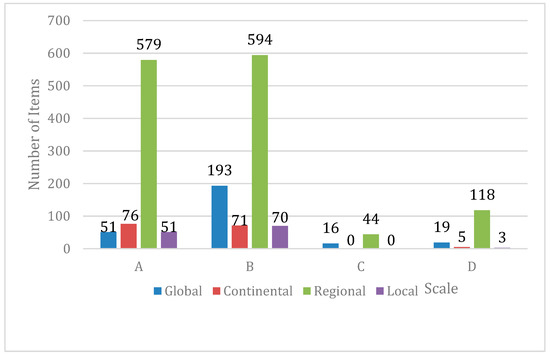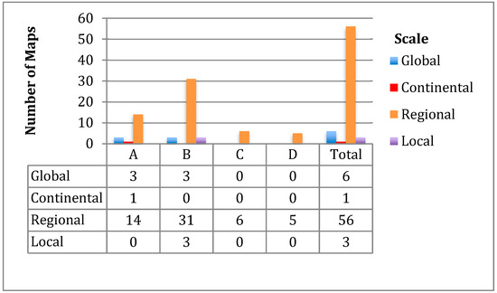 The database used a different approach to determine the scale factors, and according to that, each map in this study was examined under four subtitles: “global”, “continental”, “regional”, and “local”. Due to the large number of the maps of earthquakes in 1999, the regional maps were seen to be the majority (Figure 13). Global scale maps, which were mostly used to show the general fault systems of the Earth, were not common among these maps. The use of local and continental scale maps was, as expected, very low.