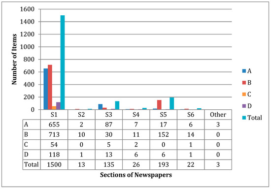 According to this statistic, newspaper B had the largest number of maps and map-like contents in its 10 years of publication. Newspaper A, which covered the whole study period, followed newspaper B with 777 items. Newspaper C began its publication in 1999. Therefore, only one year of data for this newspaper was included in the study. Newspaper D ended its publications in 1994. For this reason, there was no data from this newspaper between 1994 and 1999. Similar to newspaper C, a small number of data entries for this newspaper were provided due to the short duration of publications. The distribution of types of these items is shown in Figure 4. When considering the ratio of map-like items to all items in each newspaper, it can be seen that newspaper C had the highest number of map-like items.