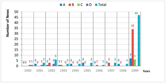 In the period covered by the case studies, five devastating earthquakes occurred in Turkey. They took place in the years 1992, 1995, and 1998, and two of them occurred in the year 1999, with magnitudes of 6.8, 5.9, 6.2, 7.4, and 7.2, respectively [21,22,23,24,25,26]. The total number of map contents used in the earthquake reports was 68 within 1500 maps in between 1990 to 2000. The annual distribution of these maps can be seen in Figure 10.
