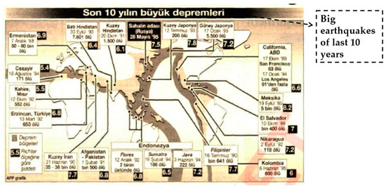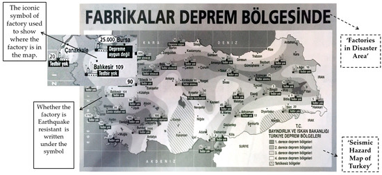 It has been seen that the cause of dramatic increase in the use of maps was the occurrence of earthquakes between the years 1990 and 2000. Specifically, when analyzing the yearly frequency distribution of maps and map-like items used in the earthquake report pages, it was observed that the frequency of map use leaped in the year 1999 (Figure 10). This dramatic change was the result of two destructive earthquakes in 1999, which took place in the same region. Despite the deaths and losses of other earthquakes (1992, 1995, and 1998), they did not appear in the print media as much as the earthquakes in 1999. The primary reason for this is that the fatality rates of the earthquakes in 1999 were very high, and they had a more devastating effect on the area and people’s daily lives, while other earthquakes only affected the urban and rural life [21,23,24]. The 1999 earthquakes took place in the industrial region of Turkey, where 40% situated of the industrial facilities are situated. In this study, five of the 68 maps (in 70 map and map-like items) were used to show only the affected industrial area in the region (Figure 11).