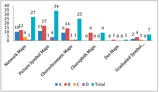 In addition to these determinations, some cartographic evaluations of used maps were obtained. This investigation was related to the design of these maps. In this direction, parameters of “map types”, “map elements” and the “scale” of maps of earthquake-related news were evaluated. With regard to “map types”, only two maps of 68 were “satellite images”, the rest were “thematic maps”. It was already expected that the maps would be “thematic”, because the search topic was about only earthquakes. The classification of thematic maps can be accessed in Figure 12 to show the most commonly used thematic map types in earthquake-related news. According to this, 34 maps used form and size such as icons, letters, figures, and numbers as picture symbol maps. The distribution of tents among the disaster zone, affected points, and damaged settlements are some examples for the usage of these maps. When using network maps to show seismic zones and earthquake lines on different scales, chorochromatic and choropleth maps are used to distinguish enumeration units of the maps using colors or color values in general. To give a hierarchy of affected zones in earthquake zones, graduated symbol maps are used. Only one example of a dot map was found, where it was used to show the distribution of earthquake affected areas in 1999.