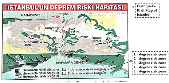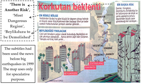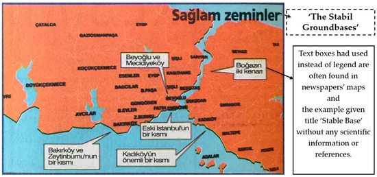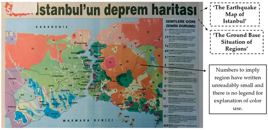With these results, it appears the nature of each attributes and their usages have been manually interpreted by authors. As a result of these evaluations, some mistakes regarding cartographic parameters were identified, preventing the maps from fulfilling their initial purpose. If cartography is a technic of communication, the measure of a “good map” is how well it conveys information from a cartographic perspective. Aesthetic issues certainly play a role in effective cartography, but it is the issue of communication that holds the central role in cartographic design [27]. Therefore, the analysis of the case study found that the maps are generally uninformative or misinformative. Almost 25% of the 66 maps were considered uninformative. In addition, some of these maps were not compatible with the news content. This might be due to the fact that the maps were used to enhance the visual appearance of the newspaper pages rather than to convey knowledge. It was also stated by Monmonier in Maps with the News that some news maps are principally informative, while others are largely decorative [3,8]. The map titled “The Earthquake Map of Istanbul” shown in Figure 14 is considered an example of an uninformative map, because although a map should be legible [8], its appearance is complicated. The symbols do not have enough separation to be seen individually. It is also thought that this map is a geological map made for other scientific purposes without concern of comprehensibleness and with no references given. Additionally, confusing legend use can be seen, and even the colors of the enumeration units used are not defined in a legend to show the hierarchy of colors. The legend should include a clear explanation of what each symbol associated with them represents; base information should also be explained in the legend if it is not obvious [12]. Query for Figure 14: “Date: ‘01/01/1990-01/01/2000’> Newspapers Name: ‘Sabah’> Image Type Query: ‘Map’> Map Types: ‘General Purpose Maps’> General Purpose Maps: ‘Thematic Maps’> Thematic Maps: ‘Choropleth Maps’> Map Elements: ‘Legend & Text & Title’> Where the image is: ‘Report’> Topic of the Report: ‘Earthquake’ “). In the following examples; Date> Image Type> Map Types> General Purpose Maps> Thematic Maps> Where the Image is> Topic of the Report: ‘Earthquake ‘are the common parameters of the case study. However, subtitles of Thematic Maps> Map Elements> Scale were determined to be optimal search terms to reach the different examples in earthquake- related maps. All these parameters could be queried with multiple selections.