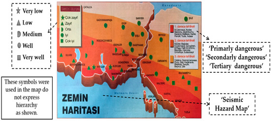 Similarly, as seen in Figure 16, there is no hierarchy between the symbols used in the legend on the left. The other legend on the right uses hues to show the “level of the seismic hazard zone”. The hue hierarchy of primary, secondary, and tertiary dangerous zones has been shown correctly.