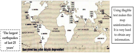 As a result of the thematic and spatial review of the maps earthquake related news, 25% of 66 maps were considered ‘uninformative’, and these maps were generally used to enhance visual appearance of the news. 16% of the maps using text were considered to have a complicated and illegible text design. Therefore, this usage makes it harder to understand any information included in these maps. Since 4% of these maps might also be used to knowingly mislead, these maps were considered ‘misinformative’, spreading speculative information about the news. As discussed in the previous sections (Section 3 and Section 4), it was observed that the use of some cartographic parameters might be missing or inaccurate. Therefore, it can be concluded that most newspaper maps that are basic location maps are generally simple in content and symbolization and have designs that can be understood without specialized training [3]. In this context, newspapers play a fundamental role in continuing adult geographic education [3]. Since map reading training is not included in the basic education steps in some countries, such as Turkey [28], the way that newspapers utilize maps to convey public interest events is very important. Newspaper maps have a crucial responsibility in spreading spatial information to the public, because they are an economical and influential way to reach people from every socio-cultural level with or without a cartographic background. However, some of the maps that were evaluated through the unique database work were considered to have been designed with a poor technique and a lack of a cartographic point of view, consistent with findings of similar studies in the literature [3,6,8]. As stated above, the evaluation of newspaper maps identified a lot of cartographic errors and deficiencies. Thus, it could be concluded that the design of maps used in newspapers related to earthquakes is lacking or/and incorrect with regard to the cartographic discipline. It can be observed that the usage of maps reflects not only a belief in the news value of the story it accompanies, but often is used as visual enhancement or in the absence of a suitable photograph [3].