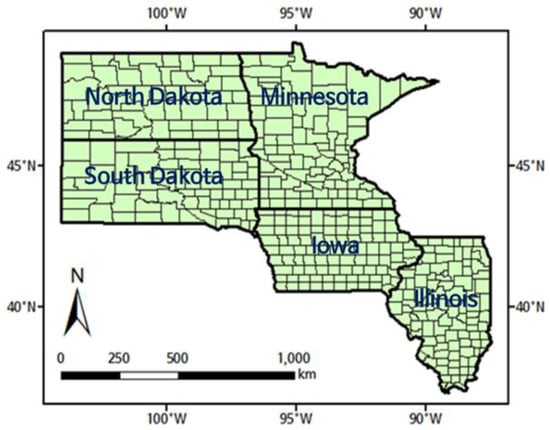 The US is the world’s largest grain exporter [], and our experiment focused on five states in the Midwestern US (Illinois, Iowa, Minnesota, North Dakota, and South Dakota), where corn and soybeans are dominant. Our study area included 407 counties in five states (102 in Illinois, 99 in Iowa, 87 in Minnesota, 53 in North Dakota, and 66 in South Dakota), which were selected because the area of cropland exceeded 50% of the county area (Figure 1).