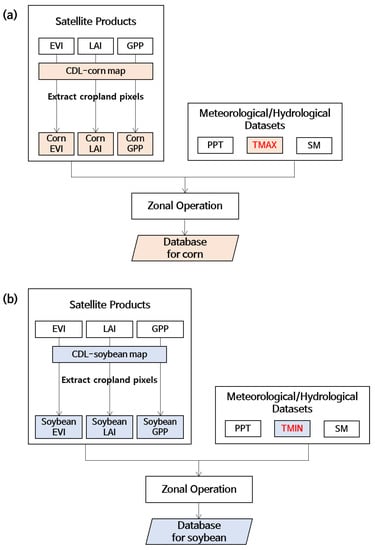Process for constructing the matchup database for (a) corn and (b) soybean, based on the Cropland Data Layer (CDL).
