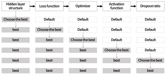 The classic ANN has a local minima problem in which an optimization process often stops at a locally, rather than globally, optimized state. In addition, generic machine learning models sometimes have problems with overfitting, in which they cannot handle data with outliers due to excessive learning from the given dataset. Such problems can be resolved by DNNs through an intensive optimization process in a deep network structure. To handle local minima and issues with overfitting, L1/L2 regularization can be employed to ensure sparsity (L1) and simplicity (L2) of the DNN model. Also, backward and forward optimization is conducted in the back-propagation algorithm to improve accuracy. The problem of vanishing gradients of loss functions, which may occur during the back-propagation process, can be managed by applying appropriate activation functions, such as sigmoid and rectified linear units (ReLU). The drop-out method deals with unexpected outliers via a learning mechanism in which the DNN model becomes more robust to extreme cases through iterations of a type of handicapped training with randomly deleted links and nodes []. In addition, a weight and bias set built in an existing DNN model can be imported as an initial value of a new DNN model for more custom-tailored training. This is called pre-training and transfer learning, which can improve the optimization of a DNN model. Fine-tuning can also be incorporated into the optimization process to adjust the weight and bias set in more detail, by including additional training data []. We set up the configurations of our DNN model through the parameter optimization procedure presented in Figure 3.