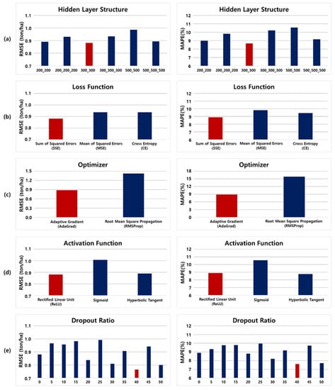 The results of the optimized deep neural network (DNN) model: root mean square error (RMSE) and mean absolute percentage error (MAPE) according to the (a) hidden layer structure, (b) loss function, (c) optimizer, (d) activation function, and (e) drop-out ratio.