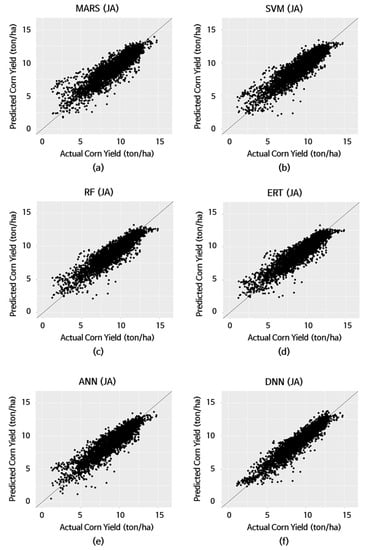 Actual versus predicted corn yields from 10 rounds of experiments for July–August (JA) (major productive period), 2006–2015: (a) multivariate adaptive regression splines (MARS), (b) support vector machine (SVM), (c) random forest (RF), (d) extremely randomized trees (ERT), (e) artificial neural network (ANN), and (f) deep neural network (DNN).