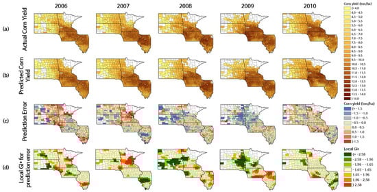Maps of the actual and predicted corn yields, prediction errors, and Local Geary index (Gi*) of the prediction errors, 2006–2010.