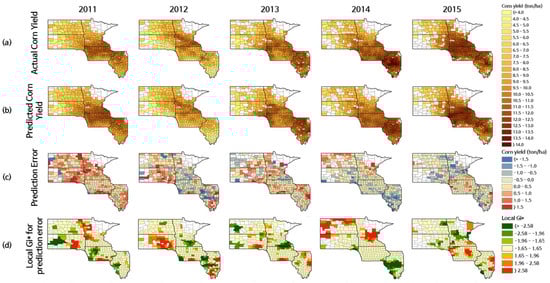 Maps of the actual and predicted corn yields, prediction errors, and Local Geary index (Gi*) of the prediction errors, 2011–2015.