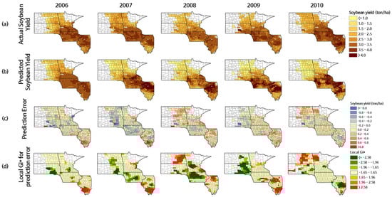 Maps of the actual and predicted soybean yields, prediction errors, and Local Geary index (Gi*) of the prediction errors, 2006–2010.
