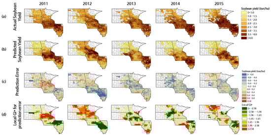 Maps of the actual and predicted soybean yields, prediction errors, and Local Geary index (Gi*) of the prediction errors, 2011–2015.