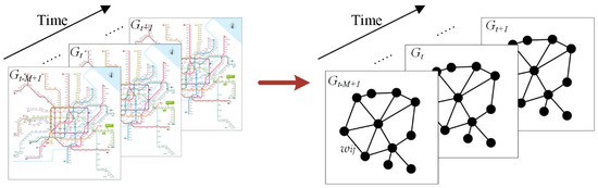 As the prediction of the passenger flow volume of a citywide metro network is a typical spatiotemporal series prediction problem, we can predict the passenger flow volume at a subsequent time step given the previous M observations. In this work, we define a citywide metro network on a graph and focus on structured time-series of passenger flow volume. As shown in Figure 1, is an observation vector of n metro stations at time step t, each element of which records the historical passenger flow volume for a single metro station. The observation is not isolated in space but is rather linked by pairwise connection in the graph. Therefore, the passenger flow volume of the citywide metro network can be regarded as a graph signal that is defined on an undirected graph with weights wij. At time step the t, in the graph , is a finite set of vertices corresponding to the observations from n monitoring stations in a metro network; is a set of edges, indicating the connectedness between stations; while denotes the weighted adjacency matrix of .