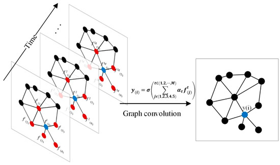 After constructing the graph-structured metro network data as described in the previous section, we extract the local irregular spatiotemporal dependencies of the metro network using the GCNN. Taking vertex i as an example, Figure 2 shows the conventional graph convolution with a kernel size of one (K = 1). Actually, this is the convolution calculation performed with the first-order adjacencies. Obviously, the spatial dependencies between vertex i and its five first-order adjacent vertices (marked as 1, 2, 3, 4, and 5 in Figure 2) are captured. The illustrated operation is executed for all vertices. For the metro network passenger flow volume time-series data of the previous M intervals, we construct a stereogram convolution kernel to seamlessly extract the spatiotemporal dependencies. The M historical flow-volume graphs are stacked in the temporal dimension. In the stereogram graph convolution, convolutions are seamlessly performed in both the spatial and temporal dimensions, as shown in Figure 3. We define the notion of the spatiotemporal graph convolution operator “” as the multiplication of a signal with a stereogram kernel :