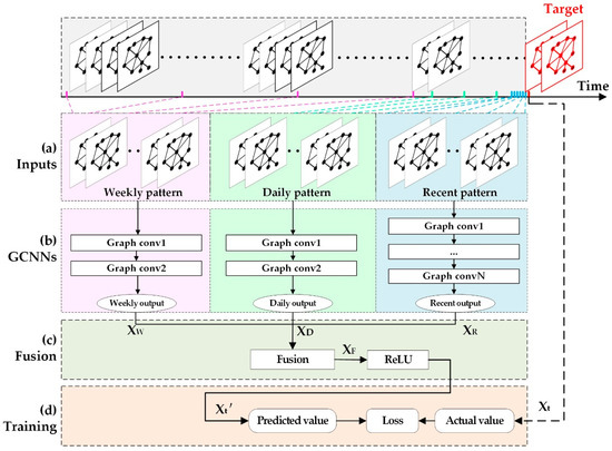where is the prediction target in the tth time interval, ◦ is the Hadamard product (i.e., element-wise multiplication), and , , and are the learnable parameters that adjust the degrees affected by recent, daily, and weekly dependencies, respectively. The fusion result is activated by (i.e., ReLU) to obtain the prediction target.