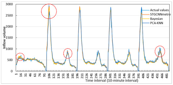 From the results of the prediction of inflow volume using the test set, shown in Figure 7, it can be seen that the values predicted by the STGCNNmetro, Bayesian, and PCA-kNN models correspond well to the actual values. In some time intervals (i.e., morning and evening, see the red circle in Figure 7), the values predicted by the STGCNNmetro model are superior to those predicted by the Bayesian and PCA-kNN models. The following is a detailed analysis of the prediction of inflow volume for a Sunday (non-working day) and a Monday (working day):