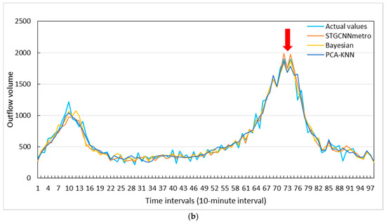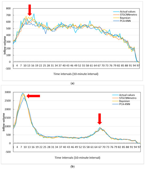 As shown in Figure 8a, the STGCNNmetro model better predicts the actual values of passenger inflow volume for the non-working day than the Bayesian and PCA-kNN models. Between 8:30 and 9:30 a.m. (see the red arrow in Figure 8a), the predictions of the STGCNNmetro model are obviously superior to those of the Bayesian and PCA-kNN models. The predictions of the Bayesian model are too large, while those of the PCA-kNN are too small. As shown in Figure 8b, all three models effectively predict passenger inflow volume for the working day. However, in the morning and evening peaks, the predictions of the STGCNNmetro model are superior (see the red arrow in Figure 8b).