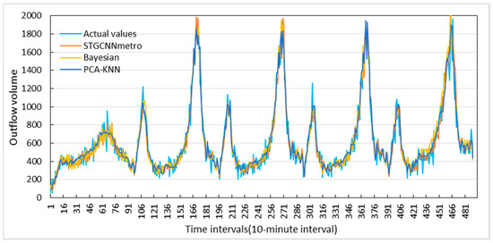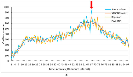 Based on the results of the prediction of outflow volume on a non-working day shown in Figure 10a, the STGCNNmetro and Bayesian models perform significantly better than the PCA-kNN model, and the prediction results of the STGCNNmetro model during peak periods are better than those of both the Bayesian and PCA-kNN models (see the red arrow in Figure 10a). Furthermore, based on the results of the prediction of outflow volume on a working day, as shown in Figure 10b, the STGCNNmetro and Bayesian models generally perform better than the PCA-KNN model. The ability of the STGCNNmetro model to capture peaks in the evening is better than that of the Bayesian model (see the red arrow in Figure 10b). However, its ability to capture peaks in the morning is slightly worse than that of the Bayesian model.