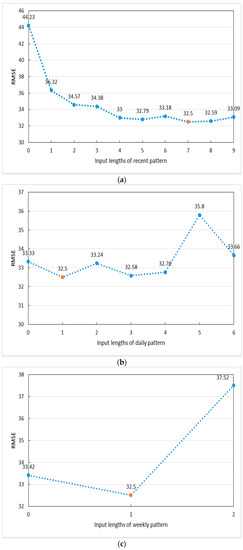 Experimental results for different input lengths of (a) the recent pattern, (b) the daily pattern, and (c) the weekly pattern. RMSE: Root-mean-square error.