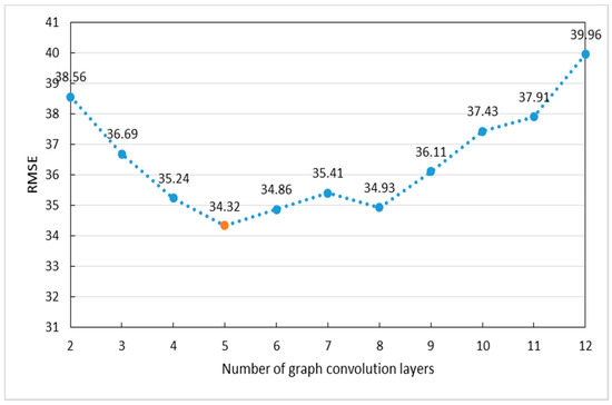 From Figure 12, it can be seen that as the number of graph convolution layers increases, the RMSE of the model first decreases and then increases, demonstrating that more graph convolution layers can give a better result since they can capture not only close spatial dependence, but also distant ones. However, when the network is very large (e.g., number of network layers ≥ 9), the training result becomes worse. The newly included stations are from Shanghai’s urban fringe and have little contribution to the passenger flow volume at the core stations. An increasing number of layers leads to more parameters and to greater training difficulty, and as a result, the RMSE increases.