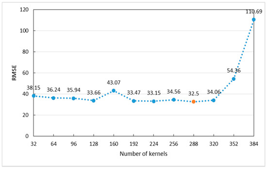 From the results shown in Figure 13, it can be seen that up to a certain level, more kernels result in a lower RMSE. However, when the number of kernels is very large (e.g., ≥352), the RMSE increases. An increasing number of kernels leads to more parameters and to greater training difficulty, and the RMSE therefore increases.