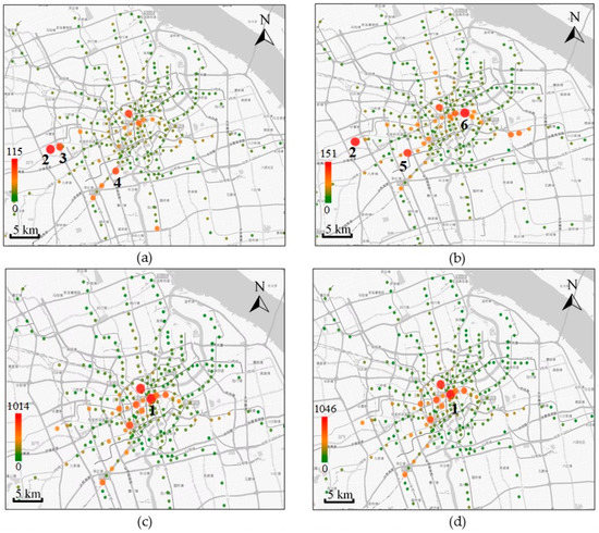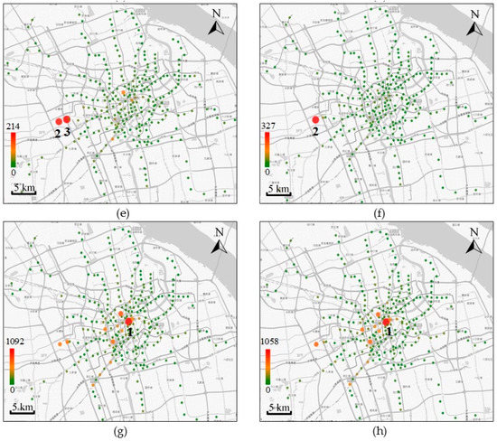 The spatial distribution of (a) the RMSE of passenger inflow volume, (b) the RMSE of passenger outflow volume, (c) the station mean actual value (SMAV) of passenger inflow volume, and (d) the SMAV of passenger outflow volume, at each metro station on working days; and the spatial distribution of (e) the RMSE of passenger inflow volume, (f) the RMSE of passenger outflow volume, (g) the SMAV of passenger inflow volume, and (h) the SMAV of passenger outflow volume, at each station on non-working days. The numbers 1–6 indicate the metro stations of People’s Square, Xu Jidong, Hongqiao Railway, Shanghai South Railway, Caohejing Development Zone, and Lu Jiazui, respectively.