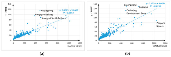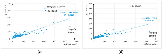 Based on the scatter plot of RMSE and SMAV shown in Figure 15, we further carry out regression analysis on these two measures and obtain the linear regression equation and the coefficient of determination (R2). The results show that, overall, the RMSE is positively correlated with the SMAV. However, several points show some differences. For example, although the SMAV of the People’s Square station (see marker “1” in Figure 14) is the largest of all stations, its RMSE is not the largest. Additionally, the RMSEs of the stations of Xu Jidong (see marker “2” in Figure 14), Hongqiao Railway, (see marker “3” in Figure 14), and Shanghai South Railway (see marker “4” in Figure 14) are all abnormally high. The reason for this may be that they are located near the railway station and are affected by external uncertainties. Furthermore, the RMSEs of the stations of Caohejing Development Zone (see marker “5” in Figure 14) and Lu Jiazui (see marker “6” in Figure 14) are also abnormally high. All of these abnormal points should be explored using other types of data in the future.