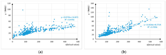 From the distribution maps of RMSE and SMAV shown in Figure 14, it can be seen that there is a positive correlation between the model errors and the actual values of passenger flow volume. To further verify the relationship between the two, they are plotted against each other in Figure 15.