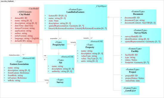 CG::CityModel is extended to include LI::LandInfraDataset’s classes and their specific attributes (Figure 1). It stores: