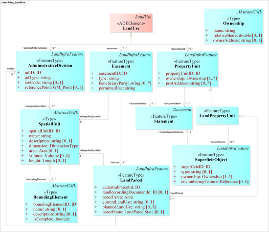 CG::LandUse is extended to include LI::LandDivision’s classes and their specific attributes (Figure 4). It stores: