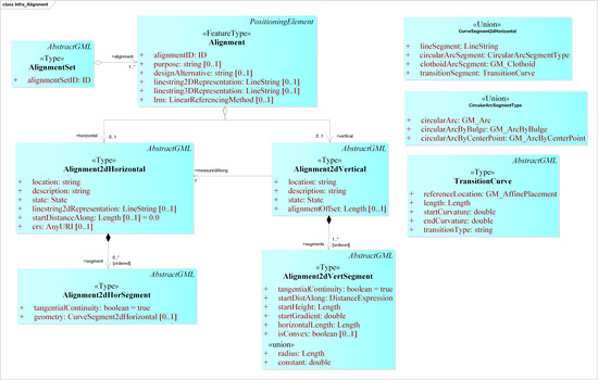 LandInfra’s LI::Alignment and its associated classes are introduced in the ADE to provide a linear referencing system for locating the features, e.g., an alignment for the centreline of a road, alignment for rails, etc. (Figure 5). An alignment can be represented as: