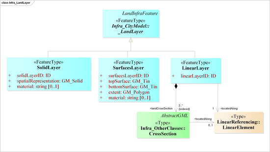 LandInfra LI::CondominiumBuilding, LI::CondominiumBuildingPart and other associated classes are introduced in the Infra ADE. The LandInfra abstract class LI::_LandLayer is introduced as it is to represent the layers underneath the land surface (Figure 6). They can be defined in three ways: As a 3D polyface mesh solid (<infra:SolidLayer>), as a collection of surface layers (<infra:SurfaceLayer>), or as a series of 2D vertical cross sections (<infra:LinearLayer>). Lastly, LandInfra LI::Survey is introduced in the ADE to model information related to the acquisition of geometry and semantic properties of features.