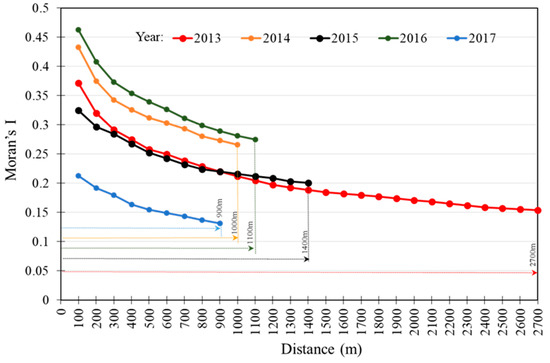 Based on the scale of urban building blocks and the analytical spatial scale used in most literature [21,70,71], a spatial weight matrix with grid size 100 m were using to calculate the Moran’s I values for the unit prices of real estate transactions in Taitung City. The annual results are illustrated in Figure 1. The strongest spatial clustering of real estate prices in the research scope occurred in an area of 2700 m in 2013, 1000 min 2014, 1400 m in 2015, 1100 m in 2016, and 900 m in 2017. These results validated that the locations and attributes associated with real estate transactions in Taitung City differed each year. Therefore, the boundaries were different. The boundary reduced to 900 m in 2016, suggesting that the clustering of real estate prices was most prominent in 2017. The Moran’s I values decreased concurrently with distance each year and eventually approximated 0, suggesting that real estate prices in Taitung City exhibit strong clustering effects. Subsequently, spatial dependence decreased concurrently with an increase in neighborhood distance.