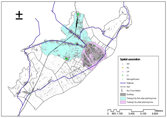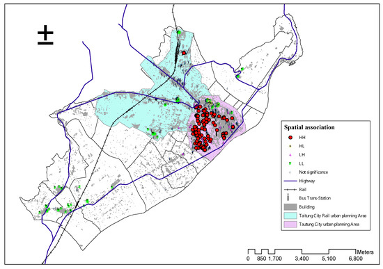 The LISA results were then incorporated into the ArcGIS system to plot the results on a basic real estate transaction map. Based on the definitions of H-H, L-H, L-L, and H-L, the LISA values were combined with the actual development situation of the research scope to show that spatial clustering and the distribution locations were present.