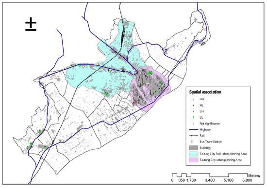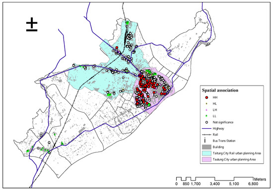 We calculated the LISA by applying the unit prices of annual real estate transactions in Taitung City to the Anselin Local Moran’s I calculation method in the ArcGIS software. We then plotted the results in the H-H, L-L, L-H, and H-L quadrants defined by LISA. The H-H quadrant represented high-priced real estate surrounded by other high-priced real estate and the L-L quadrant represented low-priced real estate surrounded by other low-priced real estate. Both quadrants represented the spatial clustering of real estate prices. The descriptive statistics of the real estate prices are tabulated in Table 5. The LISA spatial distribution diagram of the annual real estate prices in Taitung City (Figure 3, Figure 4, Figure 5, Figure 6 and Figure 7) was used to perform a year-by-year analysis.