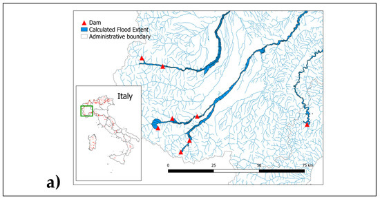 The tool resulted in an evaluation of the maximum flood extent map, the water depth map, the wave arrival time map, and population and structure damage maps (as shown in Figure 13). The damage maps were obtained through methodologies that were developed and implemented by the authors of the FloodRisk model of Albano et al. [30]. Figure 13 is an exemplification of the GIS tool’s demonstrative application. In particular, image (a) of Figure 13 shows an example of the flooded areas calculated for the potential failure of 250 dams, image (b) shows an example of the water depth map, and image (c) shows the wave arrival time maps for a dam in Northern Italy. Finally, image (d) presents the maps of population and structure damage for a dam in Southern Italy.