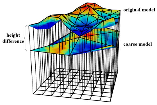 Level of Detail (LOD) is a popular technique used in terrain rendering. It can reduce unnecessary details of the terrain models and assign appropriate resolutions for areas that have different roughness or distances to the viewpoint [2]. However, the problem of inconsistency between different levels arises when using LOD, which may result in obvious visual artefacts that seriously affect the reality of the terrain model, such as popping artefacts [3,4]. The popping artefacts will bring sudden changes of the terrain model which make the user lost in the scene when wandering. In terms of height map-based terrain rendering methods, the popping artefacts could be reflected by the height difference change of coarse models at different levels. As shown in Figure 1, by performing ray casting along the height direction, the height difference between the coarse model and the original model along each ray can be calculated and we can utilize it to evaluate the popping artefacts quantitatively.