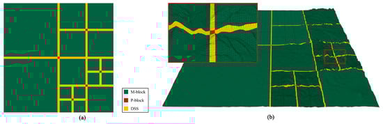 Figure 14 presents some details of how the DSS seamlessly connects adjacent M-blocks. Even if there is a big difference between the tessellation levels on both sides, the DSS can track the moving vertices on the common edges and can connect them in a seamless manner at run time (see the red circles in Figure 14b). From Figure 14b, we can see that the DSSs are well triangulated without any visual artefacts caused by thin triangles. Moreover, the junction of different DSSs is also well-handled by placing a P-block.