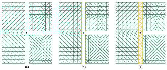After the division of the terrain, M-blocks at different quadtree levels are separated by gaps (Figure 6a). To fill these gaps with DSSs, the vertices on the common edge of DSSs and M-blocks must coincide with each other (Figure 6b) and then be triangulated into a seamless mesh of strips (Figure 6c). From Figure 6, although we can directly point out the M-blocks that are adjacent to the DSSs, it is still necessary to record the adjacency relationship of DSSs to obtain all the vertices of a DSS.