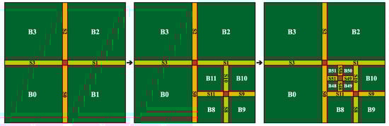 Before creating a DSS, only the MBDs of M-blocks exist. We use the field to assist the creation process. For the four edges (Figure 5b) of an M-block, their adjacent DSS indices are stored in [0]~[3], respectively. The values of the indices are obtained in the node splitting process. Let us suppose a node with an index , and that the values of its are , , , and . Then, we can calculate the values of for its children nodes according to Table 1.