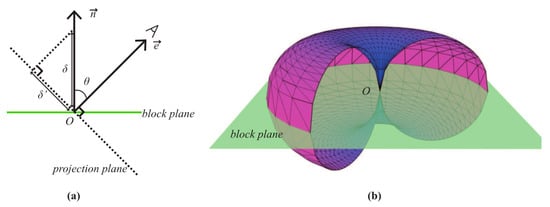 However, for height map-based terrain rendering methods, the vertical error that we actually observe is affected by the view direction. As shown in Figure 10a, is the original object-space error of an M-block. But when looking along the view direction , the object-space error actually observed is , where is the angle between and the normal vector of the block plane (Here we take the unit vector along the positive Z axis as the normal, as the terrain plane before displacement is parallel with the XOY plane). Thus, the corresponding screen-space error can be calculated as shown in Equation (3):