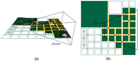 Hierarchical view frustum culling: (a) The empty quads are blocks culled by the frustum. (b) The yellow segments in the frustum represent the block edges that are used to generate DSSs.