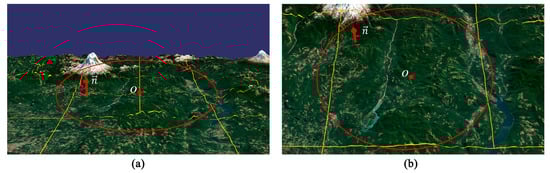 As shown in Figure 13, two different scenarios of the same region in Area I with different viewpoint parameters are presented to show the effect of the view-dependent terrain reconstruction, where is the center of the M-block enclosed in the red circle and is the terrain normal along the positive Z axis. Let be the distance between the viewpoint and , and be the angle between the view direction and . The values of and in Figure 13a,b are 725.17, 73.87 and 625.24, 35.46, respectively. These values indicate that although the viewpoint is closer to in Figure 13b, the M-block has still been retained due to a smaller . The two images in Figure 13 show that our multilevel updating scheme is well aware of the roughness of the terrain and the change of viewpoint. Thus, an adaptive tessellation mesh was achieved and the data amount processed in real time was reduced without notably lowering the visual effect.