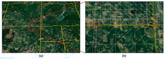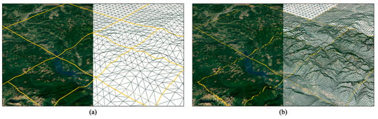 Comparison of meshes of the two methods in Area I (height map size: 1025 × 1025): (a) Method I. (b) Our method.