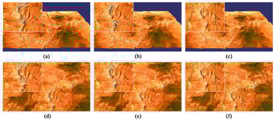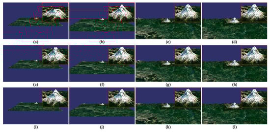 Method II divides the terrain into several blocks with equal sizes and each block has a continuous LOD, thus the transition from Figure 17e–h is smoother than Method I. However, Figure 17g shows a greater height difference than Figure 17c,k. This is because the uniform division pattern of Method II limits the adaptive refinement of terrain. This fixed pattern will not change according to the roughness of the terrain at run time. Therefore, unreasonable division may appear. For example, in rugged regions, there may be a sparse division of the terrain, and in flat regions, the terrain may be over-divided.