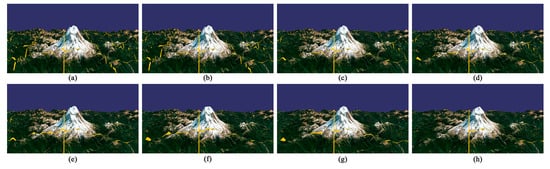 The influence of the screen-space error threshold on the visual effect was also explored as shown in Figure 19. From Figure 19a–h, some details of the peak disappeared and the quadtree division of the terrain model became coarser with the screen-space error threshold changing from 1 to 8 under the same viewpoint conditions. As described in Section 3.3.1, if increases, a lower quadtree level and a smaller tessellation level are just able to satisfy the requirement of , which results coarser meshes. Besides, when a bigger is used, the resulted coarser meshes will not be able to preserve the features in rugged regions, thus the height difference between coarse models and original model will become greater.