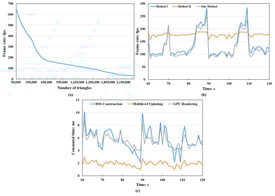 Figure 20c shows the consumed time of different stages in our method. In the entire framework, the Multilevel Updating stage (including quadtree updating, visibility testing and tessellation level computing) took up approximately 2 ms, whereas the time spent on the DSS Construction and GPU Rendering varied from 2 ms to 10 ms and 4 ms to 10 ms respectively. In general, the cost of DSS construction is largely dependent on the complexity and number of DSSs. By using a multithread strategy, the construction of DSSs is efficient and an acceptable average frame rates (125 fps) could be achieved.