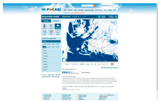 The In-Počasí web portal (Figure 3) is produced by the Czech Hydrometeorological Institute and contains a detailed weather forecast for the Czech Republic and a less detailed forecast for Europe. The portal is extensive and contains abundant weather information, including a map showing six meteorological phenomena in partial thematic layers. The map design is simple and intuitive. The composition of the map is balanced. At the top is a date bar with thematic layer information, while the section at the left allows thematic content and time options to be set. Below the map is a legend and supplementary information. Map controls are located outside the map field. The map does not show any interactive elements.